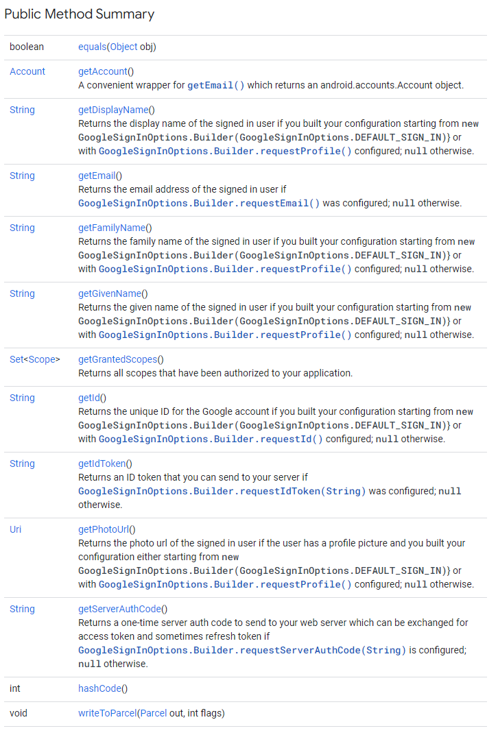 구글이 제품이 많아서 그런지 몰라도 카카오, 네이버보다 문서 양도 방대하고 좀 덜 친절한 느낌이다. 그래서 관련해서 제공하는 모바일 SDK의 Public 메서드를 좀 더 살펴보자. 아래는 GoogleSignInAccount의 문서 캡춰. 내용을 보면 AccessToken은 없고 Id Token과 AuthCode를 가져올 수 있다.