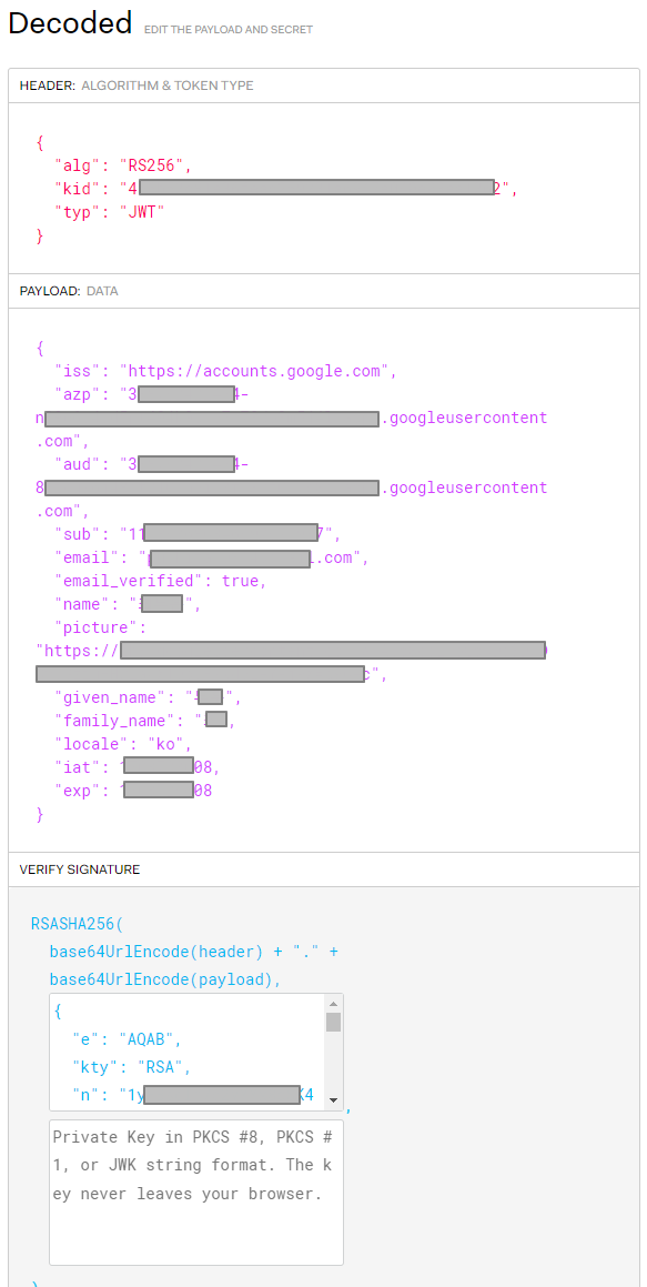 아래는 Google의 Id Token JWT를 파싱한 항목